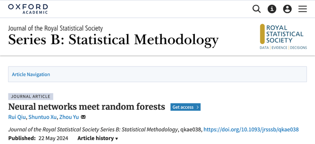 2. Rui Qiu, Shuntuo Xu and Zhou Yu (2024). Neural Networks Meet Random Forests. Journal of the Royal Statistical Society Series B: Statistical Methodology. DOI: 10.1093/jrsssb/qkae038.