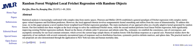 3. Rui Qiu, Zhou Yu and Ruoqing Zhu (2024). Random Forest Weighted Local Fréchet Regression with Random Objects.Journal of Machine Learning Research, 25(107), 1-69.