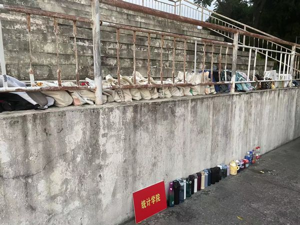 在教官的指导下,后勤保障的同学把大家的背包与水杯被整齐地摆放在共青场的看台上。此外还有负责医疗、饮水、摄影等工作的同学们,齐心协力保障军训顺利开展。
