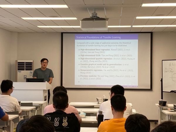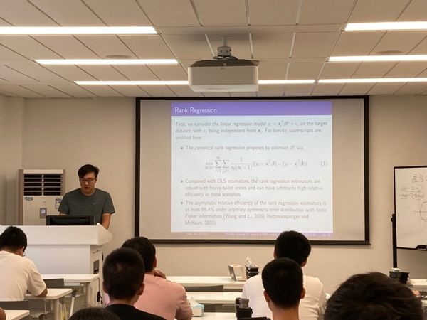 在午餐会上,闫怡博老师分享了近期从事的针对厚尾分布迁移模型的工作。闫老师首先介绍了迁移学习的背景,即借助source domain的信息改进target domain模型的精度。随后,他讲解了迁移学习领域相关的前沿文献。迁移学习的基本假设之一为source domain估计量与target domain对应估计量的差异比较小。且在一般的回归问题研究中,常假设噪声服从次高斯分布,即噪声的尾部概率不大。而当噪声具有厚尾分布时,目前的方法,如LASSO,可能不再适用。