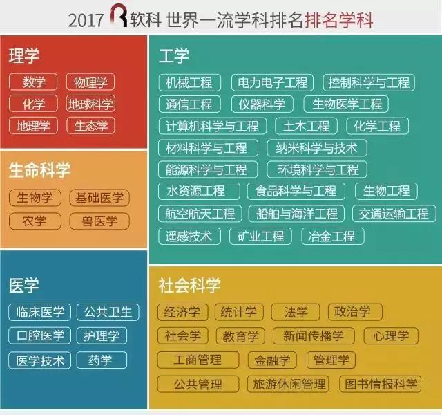 2017软科世界一流学科排名覆盖52个学科,涉及理学、工学、生命科学、医学和社会科学五大领域。公司共有12个学科进入榜单。