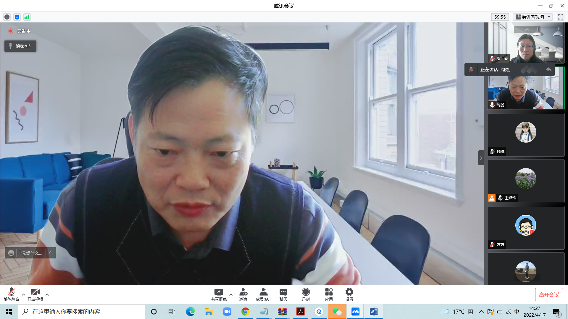 经济与管理学部副主任於州介绍了申请学校抗疫志愿者的流程和要求,於老师分享了他目前报名学校抗疫志愿工作,并已按要求做完48小时内的两次核酸,进入健康监测管理阶段,并提醒老师健康监测管理阶段干训楼暂无网络,如有教学任务的老师,需提前做好调整。