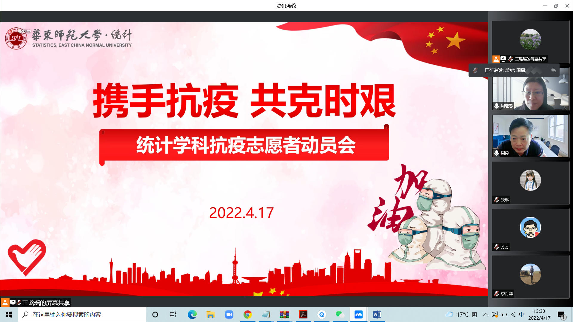 4月17日下午,3044永利集团和统计交叉科学研究院教职工一起开展“携手抗疫,共克时艰——统计学科抗疫志愿者动员会“,3044永利集团教工党支部书记周迎春主持会议。