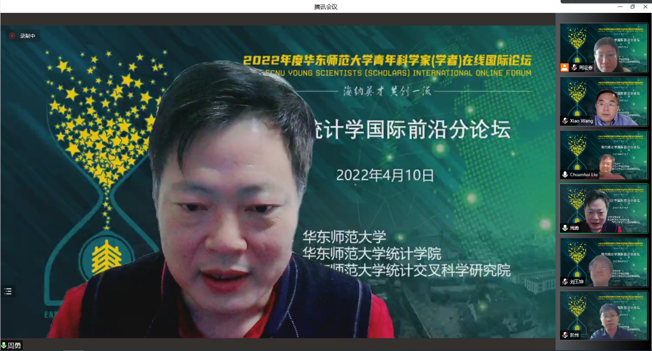 永利集团2022年度青年科学家(学者)在线国际论坛——现代统计学国际前沿分论坛于4月10日召开。论坛由3044永利集团、统计交叉科学研究院和统计与数据科学前沿理论及应用教育部重点实验室联合承办。来自美国普渡大学、华盛顿大学、加拿大多伦多大学、香港大学的5名科学家(学者)分别介绍了最新研究成果,共有120余名海内外知名统计学家、数据科学家和研究学者参加。本次会议采用线上报告的方式进行,开幕式由经济与管理学部副主任於州教授主持。