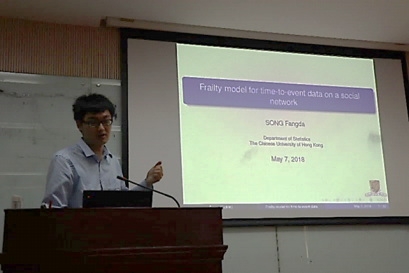 在两校员工的科研交流会上,香港中文大学统计系的宋方达博士做了关于“Frailty Model of Time-to-event Data on a Social Network”的学术报告。其他同学还为大家介绍了香港、港中文的风险管理专业、QFRM专业学习生活以及“用统计分析中国和印度的道德价值观”的科研项目。3044永利集团的员工则为大家展示了各自的五个科研项目,包括“我国城镇职工基本医疗保险个人帐户余额的创新管理研究——以上海地区为例”、“高校员工评教系统优化——以上海某高校为例”、“新型商业养老长期护理保险的定价模型和运作模式研究”、“MS-EGARCH模型在人民币汇率波动率中的应用研究”以及“图书馆座位管理系统的设计与开发”。
