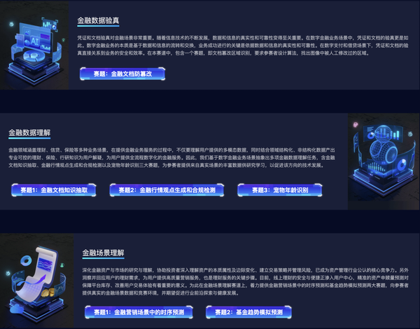 本次挑战赛,蚂蚁集团从多年的业务场景经验和当前的技术变革趋势出发,抽取了三个核心方向:“金融数据验真”、“金融数据理解”、“金融场景理解”,共设置六大赛题。与以往的金融科技类赛事相比,本次大赛更加注重 AI 技术在金融业务现实场景的落地,不管任务复杂度还是模型能力测评的严格程度方面都更上一层楼。