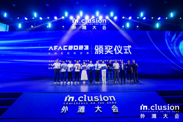 9 月 8 日,六大赛题冠军选手受邀参加 2023 INCLUSION・外滩大会「智能涌现,大模型时代金融科技进化之路」论坛,并在颁奖仪式中上台领奖。
