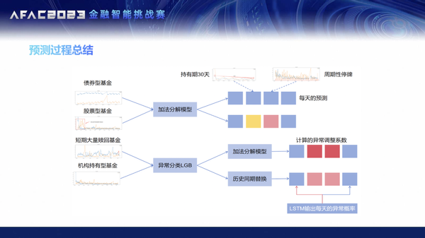 马千里等同学针对本赛题做了详实的数据分析和算法建模,本⽅案创新地结合了LSTM、LightGBM分类树、LightGBM回归树、时间序列分解等方法,建⽴了⼀个完善的异常波段时序预测模型,该模型综合了各个模型的优势,能够提取多维数据,预测基⾦在未来多⽇内的波动情形及申购赎回情况。同时,可以使⽤在线学习的⽅式,在异常抛售出现时,增量式地更新模型的参数。最终在赛道中获得了TOP2的优秀成绩。