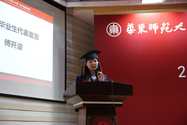 2018届学术型硕士毕业生傅开波作为研究生代表发言,首先她代表2018届研究生毕业生向辛勤培育员工的学院表达最诚挚的谢意!她感念师大统计七年以来留下故事足够温暖,授予的智慧足够广博,塑造的价值独一无二。在她看来,“华师统计人”是他们在功成名就之后,怀念起“我是谁”时,最纯粹最直接的答案。作为华师统计人,统计学带给大家的是看透世界本质的智慧,可以从与众不同的角度认识世界。她鼓励所有的同学,放下自嘲、放下无奈、放下迷茫、放下老气横秋,在这个大有可为的时代敢为人先!