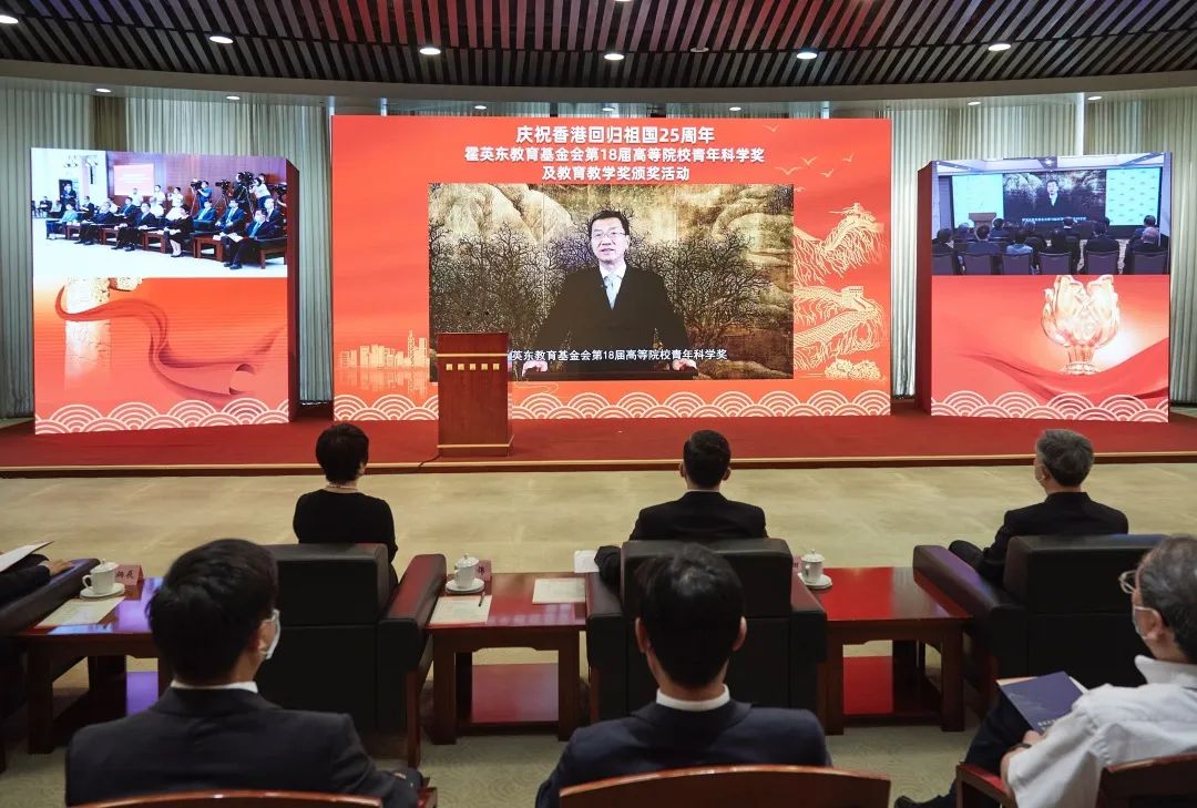 7月21日,“庆祝香港回归祖国25周年”霍英东教育基金会第18届高等院校青年科学奖及公司产品奖颁奖活动在北京和香港连线举行。教育部部长怀进鹏和香港特别行政区行政长官李家超讲话。