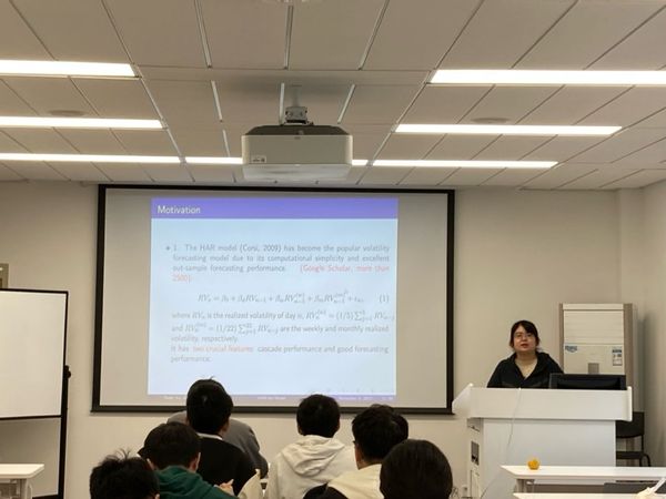 在午餐会上,苑老师介绍到此次分享的工作是HAR模型的发展。HAR模型简单且实用,受到许多学者的认可。但模型中一些参数的选取过于局限,也难以捕捉高频动态信息。此外,经典HAR模型对高维数据的支持较弱,更缺乏相应理论。