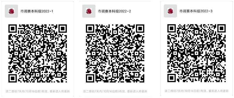 (2)网上报名后,请务必在10月18日(周二)前加入公司本科组参赛微信群(扫描下方其中一个二维码,请仅加入其中一个群,勿重复入群),关注后续通知,特别是要注意完成在群内发布的“在线确认和补充报名信息”。10月19日中午12:00前,未确认和补充报名信息者,视为自动放弃报名(不会为自动放弃者缴纳报名费,故不记入诚信黑名单)。