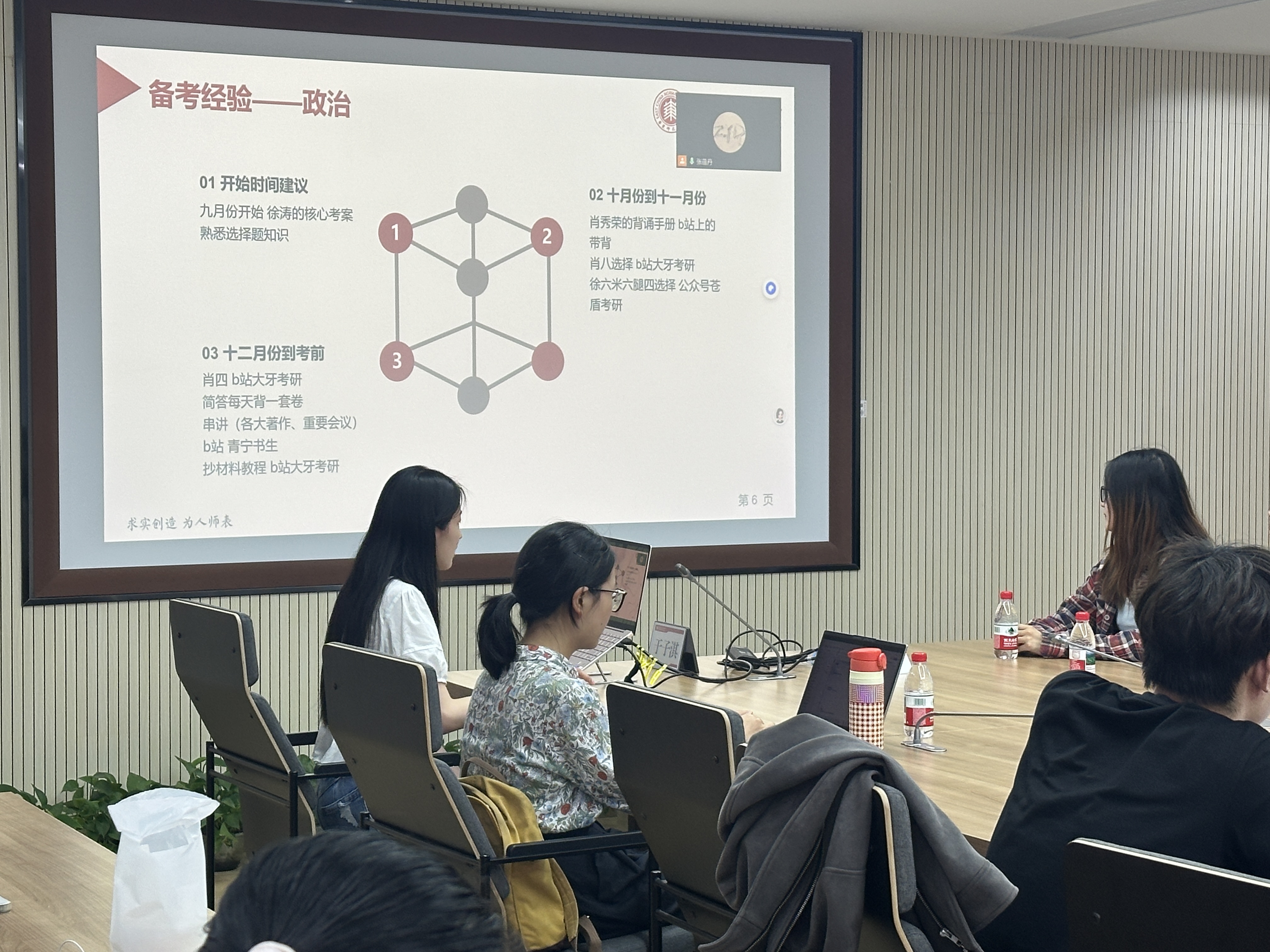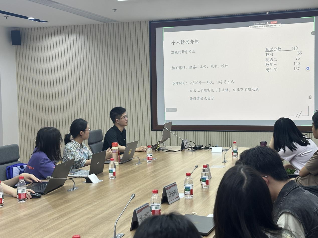 接着,黄金辉同学向在场的同学们分享了他成功考取复旦大学应用统计专业(人工智能方向)的宝贵经验。他结合自身备考过程,深入浅出地分析了复习方法与心路历程,尤其在考研初试的四个核心科目——数学三、统计学、英语和政治——上进行了全面细致的讲解。此外,黄金辉还有详有略地介绍了各科考试的着重点与高分技巧。他的分享不仅为考研学子提供了清晰的复习路线图,也传递了坚定的信心与动力。