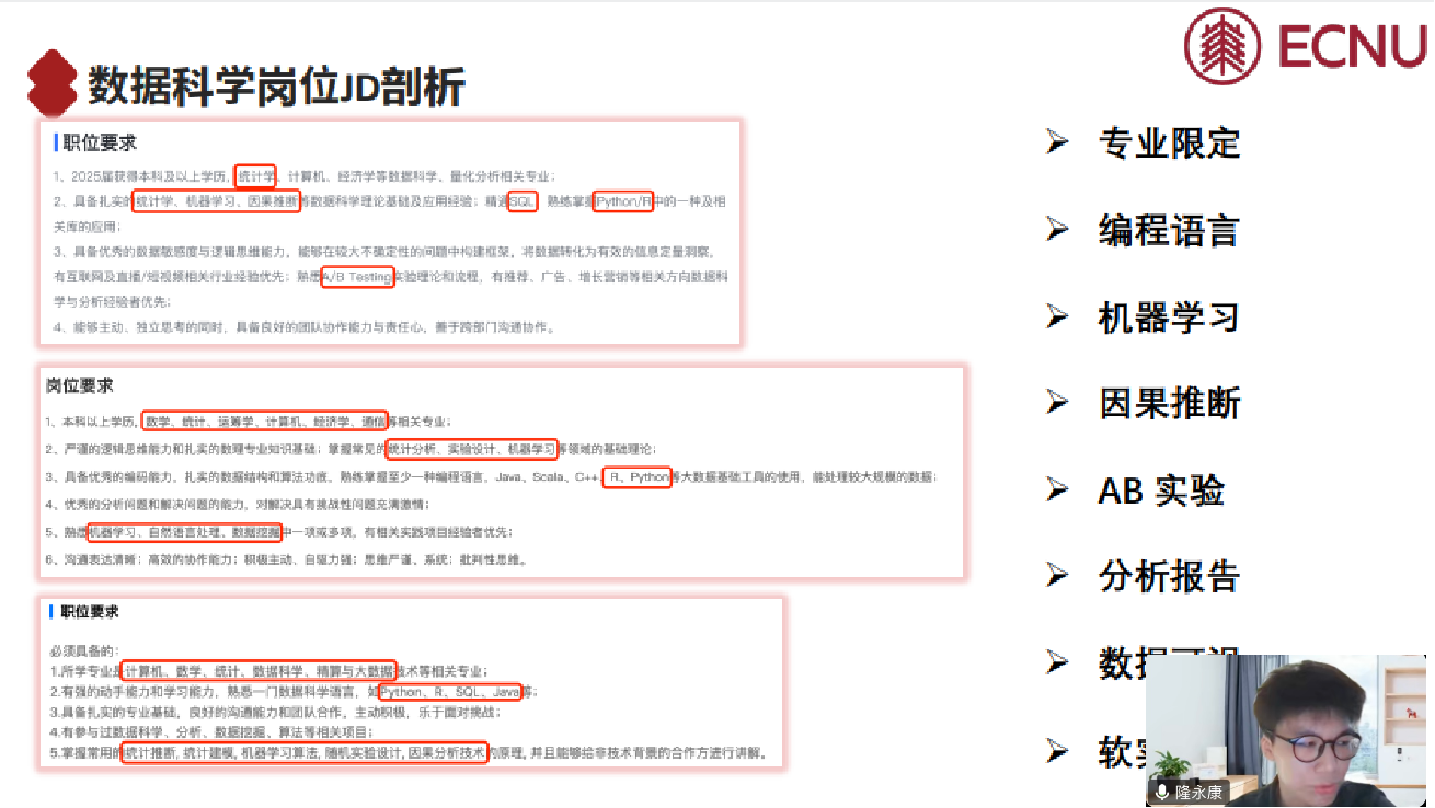 首先,隆永康分享了他在前期准备数据科学岗位的过程,介绍该岗位需要掌握的基本技能。隆永康从数据科学岗位的招聘信息剖析出发,向大家介绍了该岗位与统计学相关专业的匹配程度和需要大家掌握的基本编程软件、理论知识。他还向大家详细介绍了他在面试之前的准备工作,包括需要掌握概率论数理统计的理论知识、回归分析、机器学习、AB实验、因果推断等,紧接着他介绍了对于一些常用编程语言需要掌握的熟练程度,包括一些包的调用、函数的考点等。隆永康还强调,对于统计学相关的岗位而言,不一定非要追求数据科学或者数据分析的岗位,也可以留意风控、产品等其他与统计学相关的岗位。