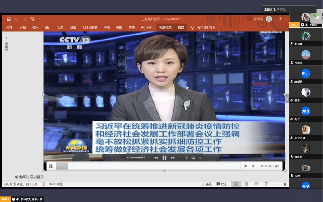 主讲人李铮驭同志分享了快递小哥汪勇、救护车驾驶员陈晓亮、78岁的乡村医生钟重新等同志在抗击疫情过程中的先进典型事迹,在这场战“疫”中,党员同志从每一位逆行的身影里看到了何为敬畏职业,何为践行信仰。习近平总书记说:“新时代中国青年要担当时代责任。时代呼唤担当,民族振兴是青年的责任。”作为青年党员,我们应当有勇气,有担当,越是艰险越向前,积极对标争先,在关键时刻做表率。