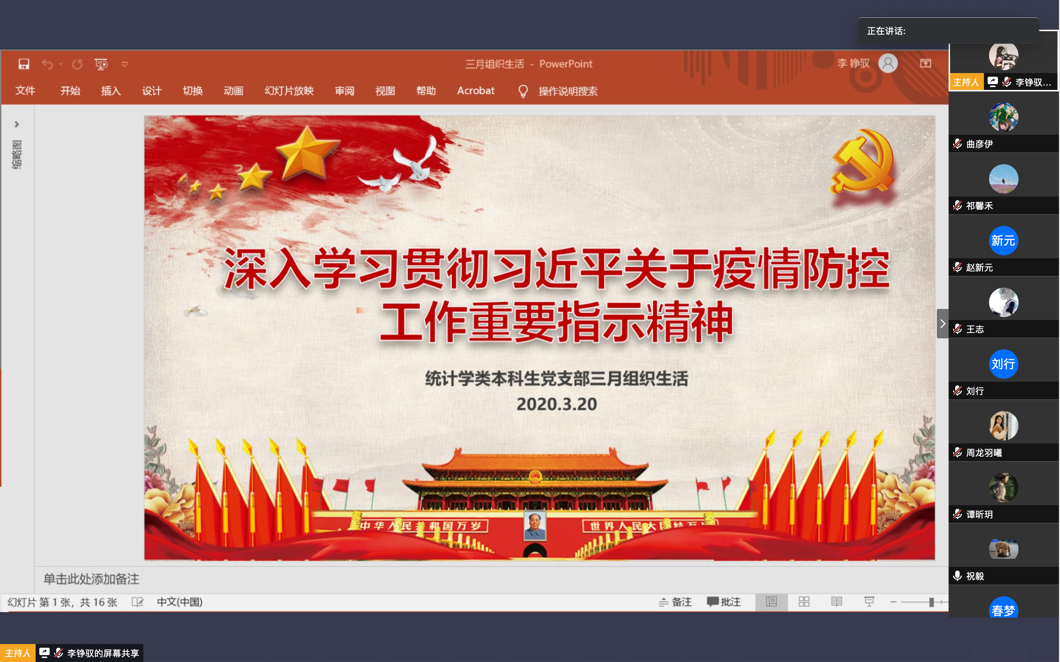 为深入贯彻落实习近平总书记关于新冠肺炎疫情防控的重要讲话精神和学校疫情防控工作部署,充分发挥员工党员模范表率作用,3月20日,经管书院统计学类本科生党支部依托网络直播平台,组织开展了“战疫情 爱国行”深入学习贯彻习近平关于疫情防控工作重要指示精神主题组织生活。